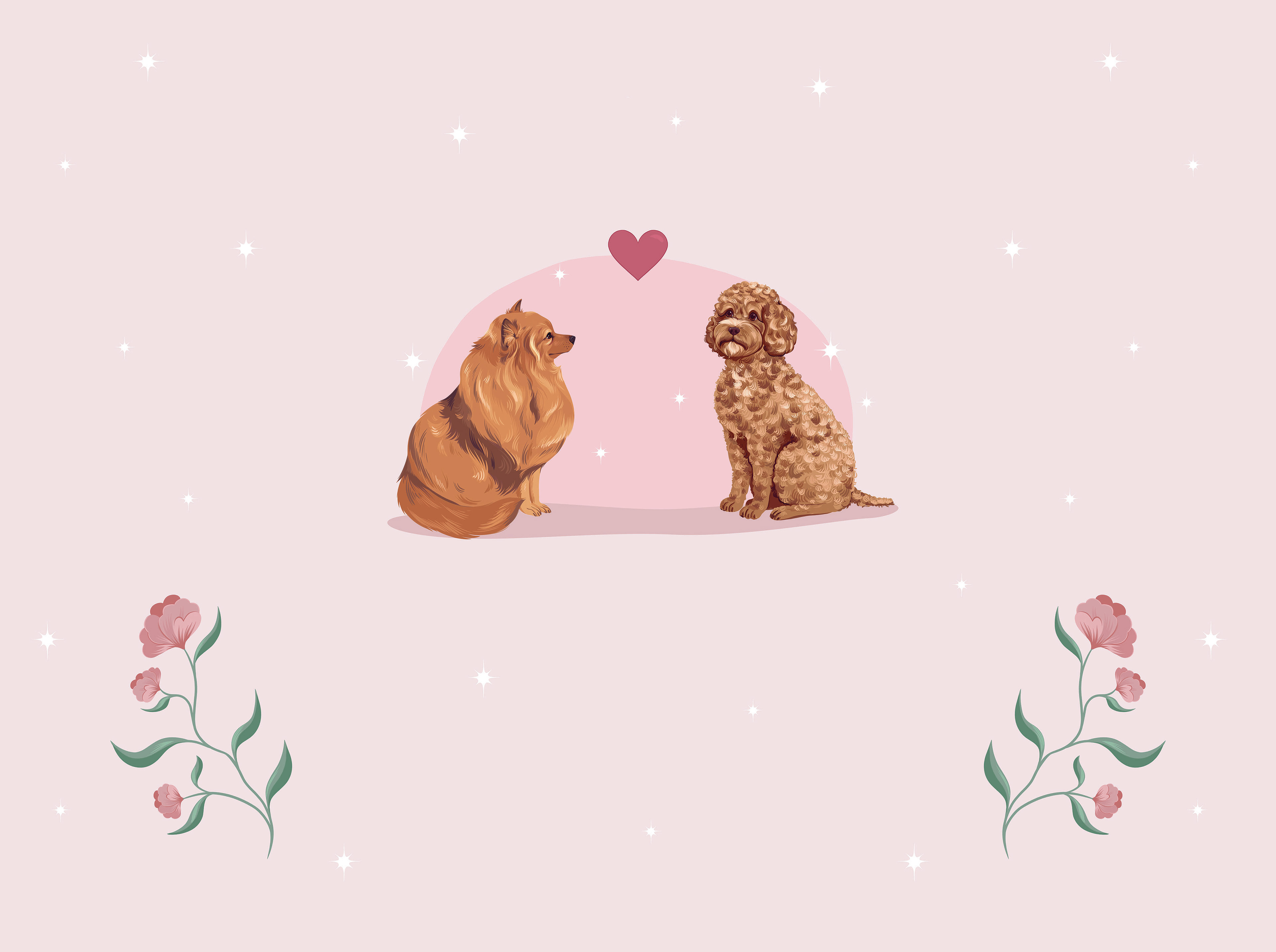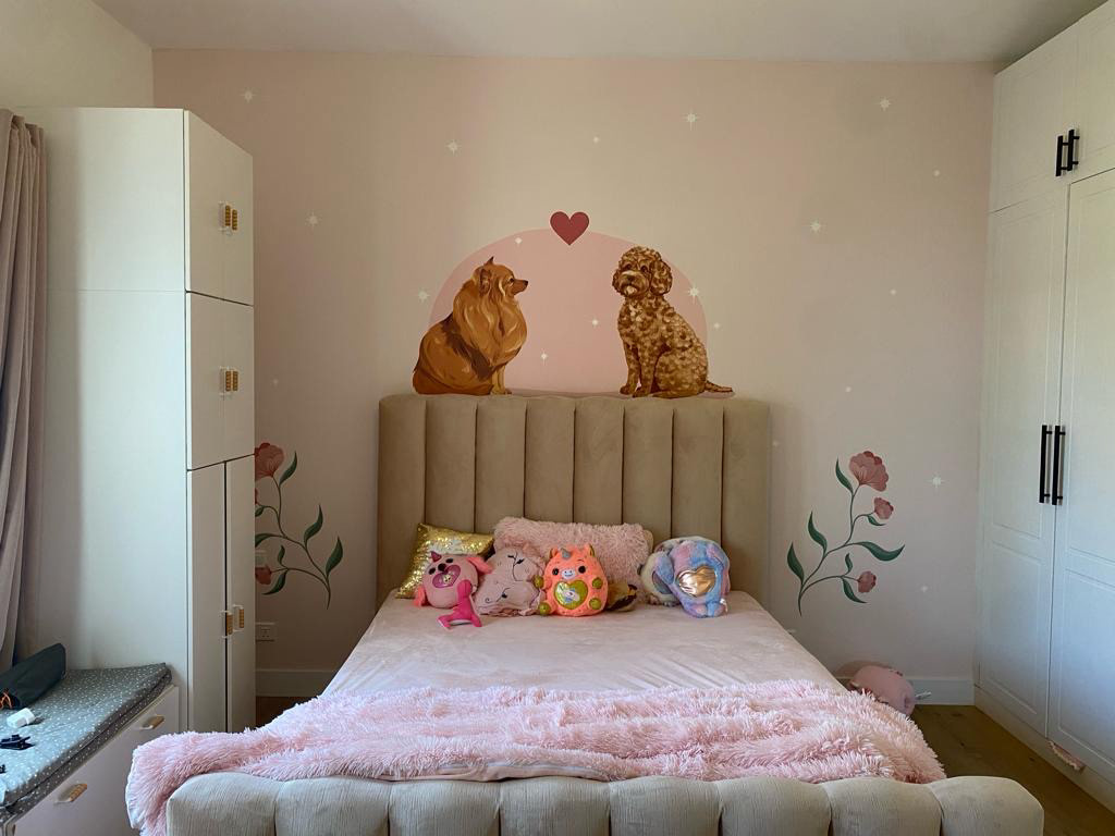 Jeg lagde denne illustrasjonen på bestilling for The Wallpaper Kids, som tilbyr spesialtilpassede tapeter for barn, skreddersydd for ethvert behov. Hovedillustrasjonen er basert på de to hundene i familien til kunden.